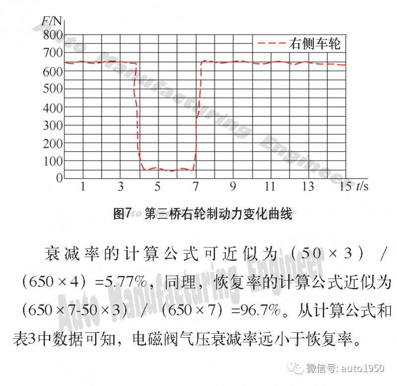 电磁阀气压衰减率和恢复率的计算是按照程序设定的算法,通过制动力曲线可近似计算,如图7所示为表3中第三桥右轮电磁阀检测时绘制的制动力变化曲线。