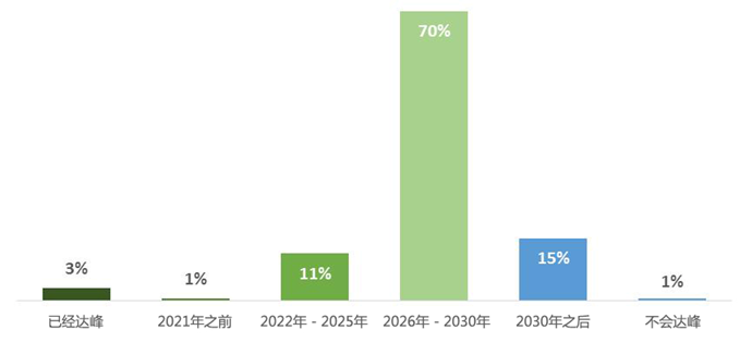 85%的受访者预计,中国将在2030年前或不晚于2030年实现二氧化碳排放达峰。只有15%的受访者预计中国的排放量将在2025年或更早达峰,较去年调查中的36%有所下降。